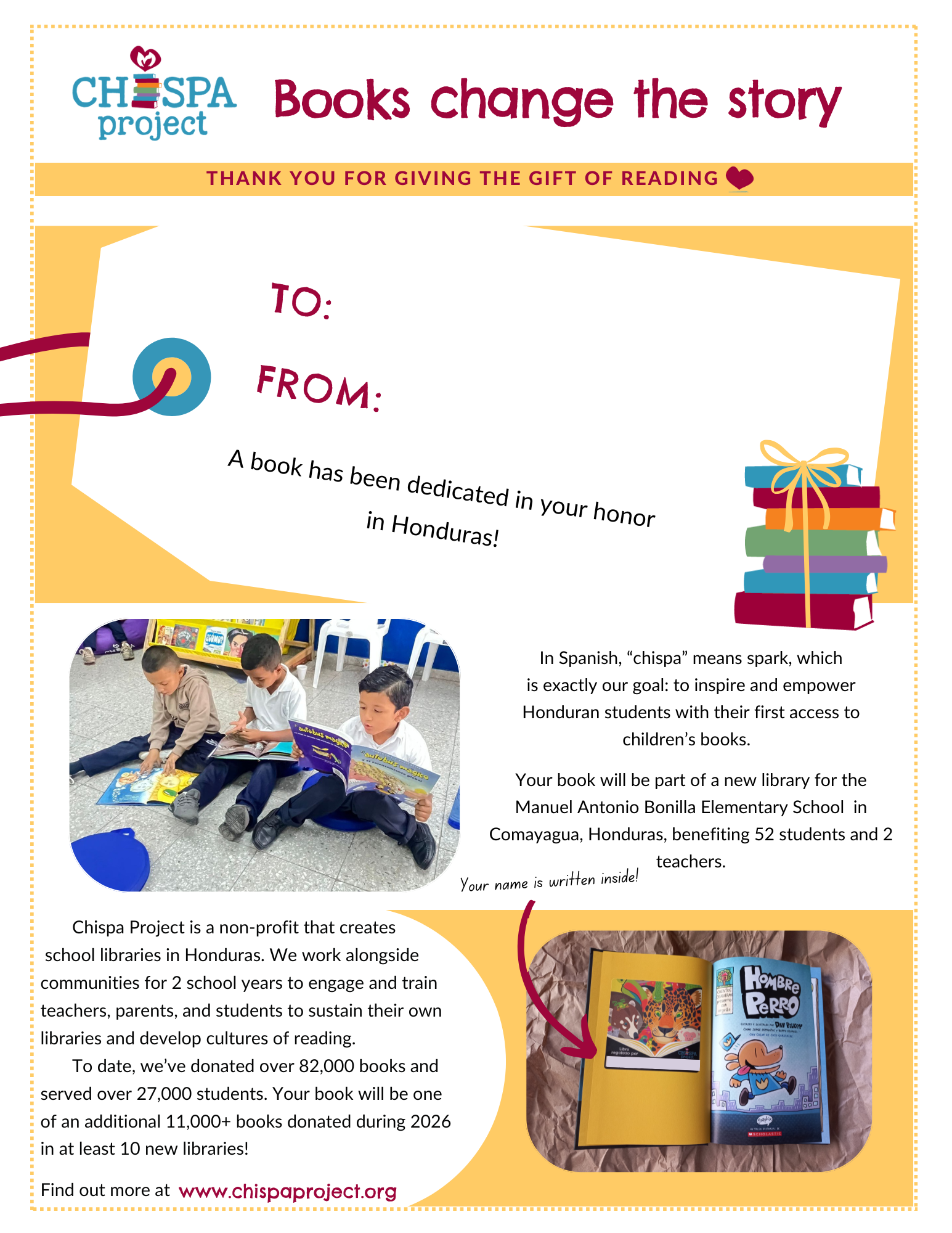 We will write your special someone’s name on a book plate inside the front cover of a book in the genre you chose. These books will support Manuel Antonio Bonilla Elementary School in Comayagua, Honduras.